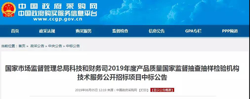 日前,中國政府采購網(wǎng)發(fā)布了國家市場監(jiān)督管理總局科技和財務(wù)司2019年度產(chǎn)品質(zhì)量國家監(jiān)督抽查抽樣檢驗機構(gòu)技術(shù)服務(wù)公開招標(biāo)項目中標(biāo)公告。