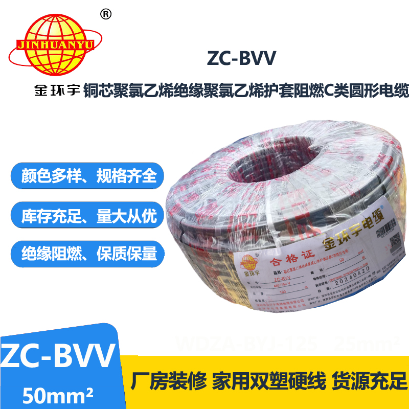 ZC-BVV電線是銅芯聚氯乙烯絕緣聚氯乙烯護(hù)套圓型電線。ZC-BVV 50平方是指電纜是1根銅芯為50平方毫米的電纜。