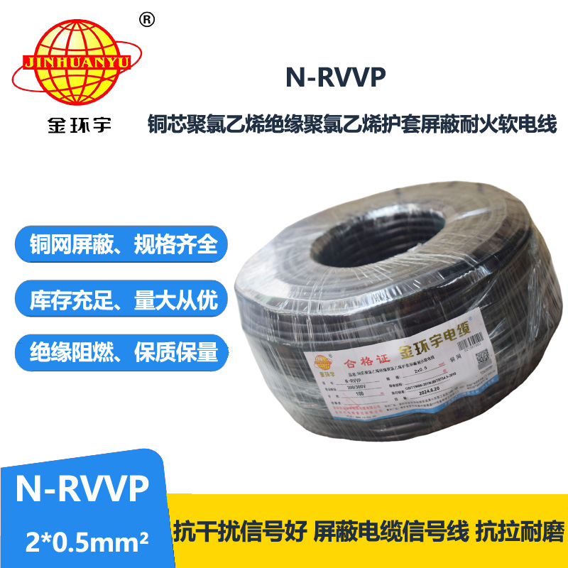 N-RVVP 2×0.5平方電纜是2根0.5平方銅芯耐火聚氯乙烯絕緣外加屏蔽和聚氯乙烯護(hù)套做成的抗干擾軟電纜。
