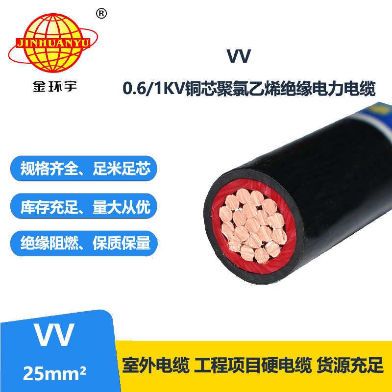 VV電纜是銅芯聚氯乙烯絕緣聚氯乙烯護套電力電纜,兩個字母V代表了絕緣和護套的材料都是聚氯乙烯。1*25平方是指電纜的銅芯為25平方毫米。