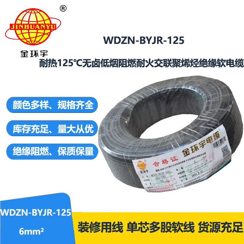 WDZN-BYJR-125是一種交聯(lián)聚乙烯新型裝修的布電線。WDZN-BYJR-125布電線的特點就是低煙量、無鹵素、阻燃、耐火。每個字母代表的意思:W代表無鹵;D代表低煙;Z代表阻燃;N代表耐火;125代表溫度可達到125℃,YJ代表交聯(lián)聚乙烯絕緣;R代表軟。其導(dǎo)體主要是銅線,有薄的絕緣層和良好的電氣機械性能,以及耐熱、防潮、耐溶劑等性能,選用不同的絕緣材料可獲得不同的特性。